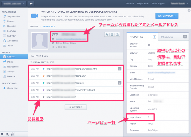 PEOPLEメニューの活用については、アップルップル山本のブログエントリ「mixpanel は ENGAGEMENT よりも PEOPLE が面白い」にも詳しく書かれています。参考にしてみてください。