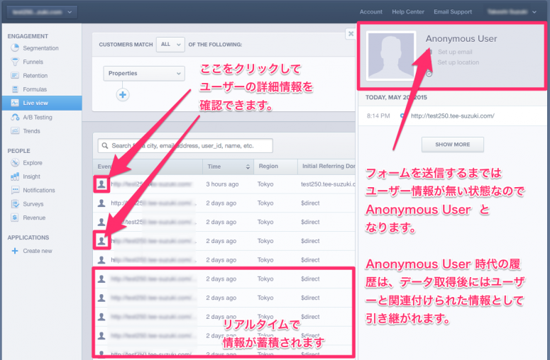 ここまでの設定・カスタマイズが終わったら、実際にMixpanelにデータが蓄積されていくのを確認できます。