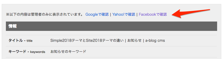SEOの情報をチェックするためのテンプレートに「Facebookで確認」のリンクを追加しています。これにより書いた記事をFacebookにシェアした時にどのように表示されるか、Facebookデバッガーより確認しやすくなりました。