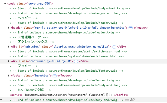 ブラウザの開発者ツールで HTML ソースを確認することで、ページのどの部分がどのテンプレートファイルによって描画されているかをすばやく特定できます。