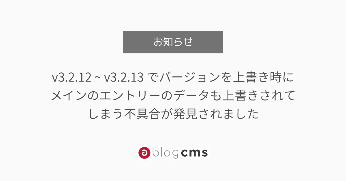 v3.2.12 ~ v3.2.13 でバージョンを上書き時にメインのエントリーのデータも上書きされてしまう不具合が発見されました 2026年2月26日 現象以下の条件の場合、バージョンを上書き時にメインのエントリーのデータも上書きされてしまう不具合が確認されました。再現する条件a-blog cms Ver. 3.2.12 〜 Ver. 3.2.13対応方法この問題が修正された、Ver. 3.2.14 がリリースされています。Ver. 3.2.12 〜 Ver. 3.2.13 をお使いの場合は、お手数ですがアップデートをお願いいたします 最後に該当する問題がございましたら、できるだけ早めのバージョンアップをご検討ください。今後もご報告いただいた内容に対して真摯に受け止め修正と改善を行ってまいります。今後ともどうぞよろしくお願いいたします。