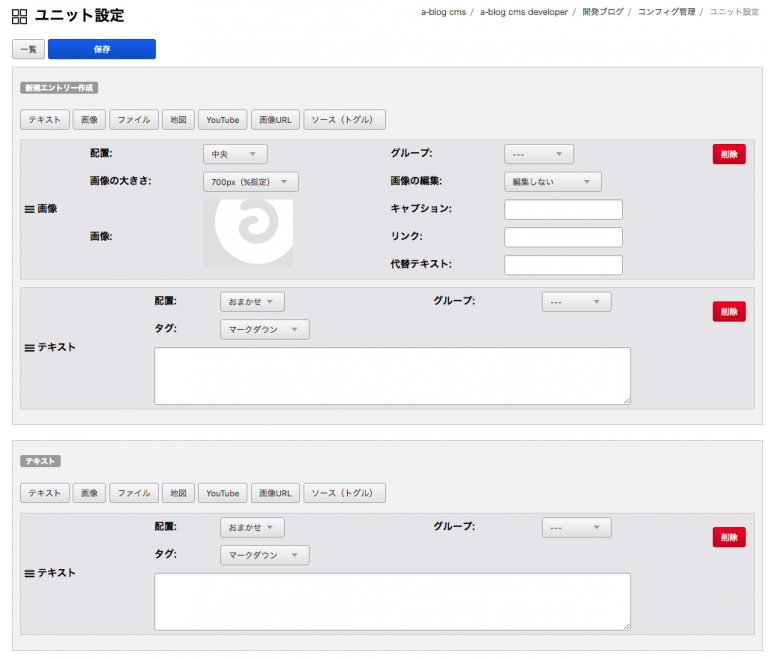 (エントリー作成)ボタンや、(テキスト)追加ボタンをクリックすると、テキストユニットが現れますが、初期は p(段落)になっているかと思います。これを コンフィグ > ユニット設定 を変更することで初期値の変更が可能です。