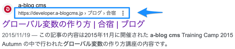 a-blog cms の公式標準テーマ(siteテーマなど)には、あらかじめパンクズリスト構造化データが実装されています。この実装により、Googleの検索エンジンは対象ページの階層表示を検索結果に表示できます。
