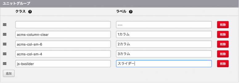 管理ページ > コンフィグ > エントリー編集設定 > ユニットグループの設定に クラス を「js-bxslider」と設定し、ラベルは「スライダー」としておきましょう。画像ユニットを囲む DIV に class="js-bxslider" というものを設定が可能になります。