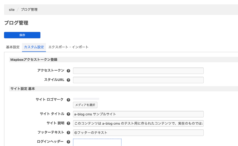 MapboxのトークンとスタイルURLは、サイト全体で共通して扱う情報になるかと思うので、ブログのカスタムフィールドから設定できるようにしていきます。 以下のコードを /themes/利用中のテーマ/admin/blog/field.html に追加してください。