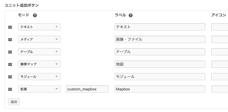 すると、管理ページ > 編集画面 > (指定の編集画面セット)> ユニット設定 に「Mapbox」が出てくるので、「Mapbox」を追加します。 そうすることで、エントリー編集画面でユニット追加時に、Mapboxボタンを押すことでカスタムユニットを表示できるようになります。