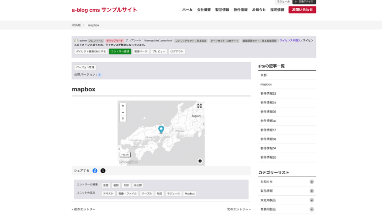 先ほど、エントリー編集画面でMapboxボタンを押すと表示されるように設定しました。 ここでは表示される内容を、HTMLを使って設定していきます。