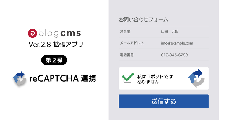 今年、2018年3月26日に公開された a-blog cms Ver.2.8ではより外部サービスと連携しやすい仕組みを用意しています。そこで今後いくつかの連携機能をa-blog cmsの本体とは別に拡張アプリという形で配布することにしました。 その第二弾として今回は拡張アプリ「reCAPTCHA」を用意しました。拡張アプリ「reCAPTCHA」を使うとGoogleのreCAPTCHAを使用してボットからの フォームアクセスを防御することが出来るようになります。 これによりお問い合わせフォームなどへのボットからの攻撃を防ぐことができます。