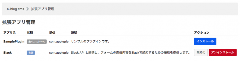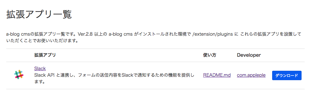 今年、2018年3月26日に公開された a-blog cms Ver.2.8ではより外部サービスと連携しやすい仕組みを用意しています。そこで今後いくつかの連携機能をa-blog cmsの本体とは別に拡張アプリという形で配布することにしました。 その第一弾として今回は 拡張アプリ「Slack」を用意しました。拡張アプリ「Slack」を使うとお問い合わせフォームなどから送信された内容をSlackに通知することができます。たとえばフォームから「資料請求」などがあれば「資料請求がありました。」などの簡単なメッセージや、メールの本文をそのまま、好きなチャンネルに通知できます。