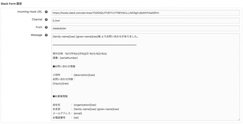 あとは、Slackに通知したいフォームIDに移動し、メッセージの送信先チャネルを「Channel」に送信元の名前を「From」に設定します。またメッセージにはフォームモジュールの変数と、グローバル変数を使用することができます。 「Message」の項目にはグローバル変数やフォーム内の変数も利用することができます。