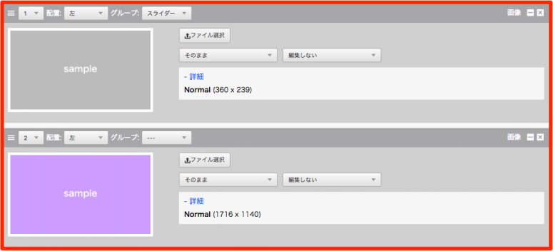 あとはエントリー編集ページより「スライダー」をユニットグループとして選択し以下のように画像を登録することで、そのユニットグループ全体がスライダーになります。