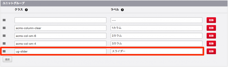 最後にユニットグループの登録です。コンフィグ > 編集設定 > ユニットグループ より「スライダー」をユニットグループとして登録します。ここではクラス名を ug-slider としています。こうすることで先ほどのJavaScriptとユニットグループが紐づけられます。