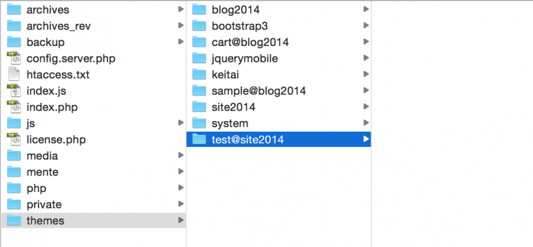 test@site2014 のようにテーマの継承機能を利用します。テーマの継承機能を利用すると、アップデートされるファイルのみをフォルダ内に入れておけば、関係無いファイルについては元のテーマのものが利用されます。詳しいテーマの継承については、ドキュメントのテーマの継承 をご覧ください。