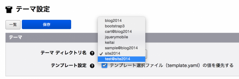 管理ページの左側の黒いメニュー部分にあるコンフィグは、システム(ブログ)全体で利用するコンフィグになりますが、特定のルールでのみ適用されるコンフィグというのが、ルールの中のコンフィグになります。そこで全てのコンフィグを上書きできますので、上記で設定している ユーザーエージェント = Test のルールの中のコンフィグのテーマ設定で test@site2014 を設定します。