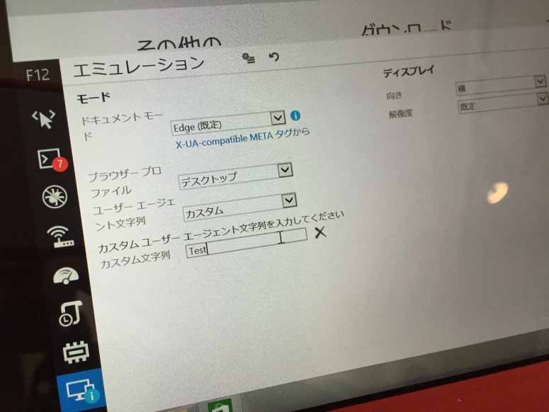 - 左側のメニューの一番下にある(パソコンとスマホのアイコン)から、ユーザーエージェント文字列 のプルダウンにカスタムがあります。