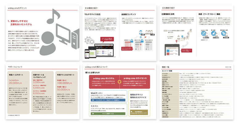 資料請求では、a-blog cms のパンフレット(A4・二つ折・4ページ)とその他a-blog cms の特徴や機能などを紹介している資料をお送りします。