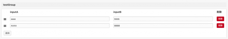 • 「testGroup」は2つのテキストフィールドを持つ(inputA, inputB)