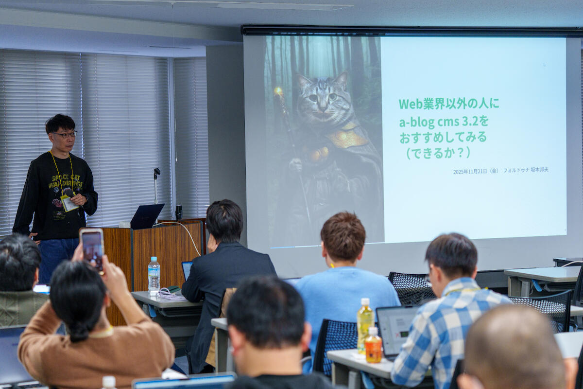 技術面では、新ブロックエディターをフル活用し、ユニットを使わずに構築。HTMX によるページ遷移のないフォーム処理や、郵便番号補完・バリデーション改善など、実務に直結する工夫も共有されました。管理機能の拡張性にも配慮されており、非常に参考度の高い内容でした。