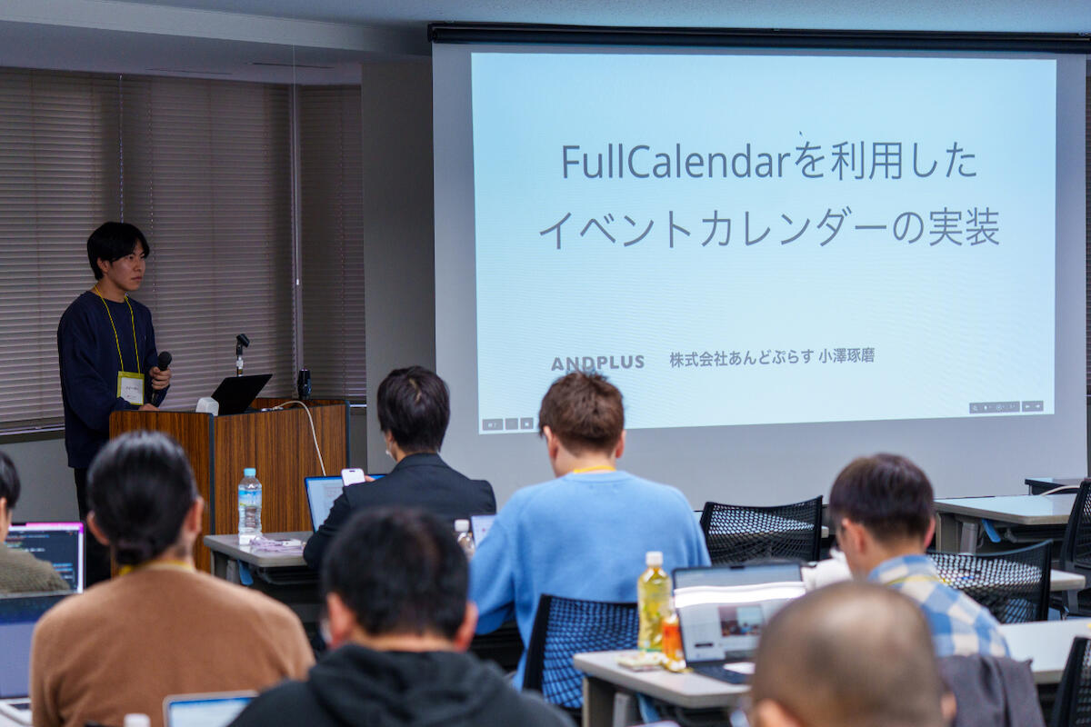 a-blog cms を活用したイベントカレンダー機能の実装事例をご紹介いただきました。イベントタイトル入力、複数イベント登録、期間設定という 3 つの要件を満たすため、標準機能の検討から FullCalendar を用いた代替実装までのプロセスが共有されました。