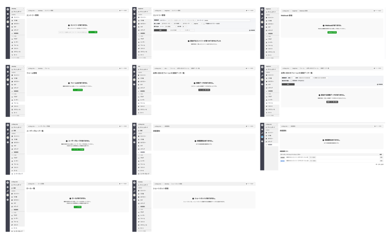 一部の機能では、空の状態を伝えるとともに次のアクションを示唆しています。たとえばエントリー管理のデータが0だったとき、新規作成ボタンのみ表示されます。
