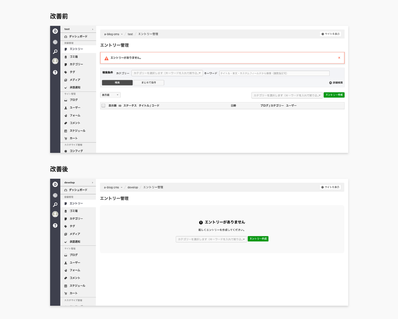データの件数が空だった時も以前までは検索フィルターと表の一部が表示されている状態でしたが、場合によってはローディング画面のようにみえてしまうことを懸念し、現在が空の状態がわかるように改善しました。