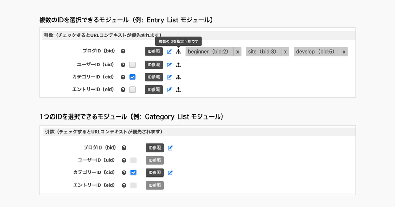 モジュールIDの引数では、モジュールの種類によってはIDが複数選択できる箇所とできない箇所がありますが、以前までは見た目では区別ができない状態だったため改善を行いました。