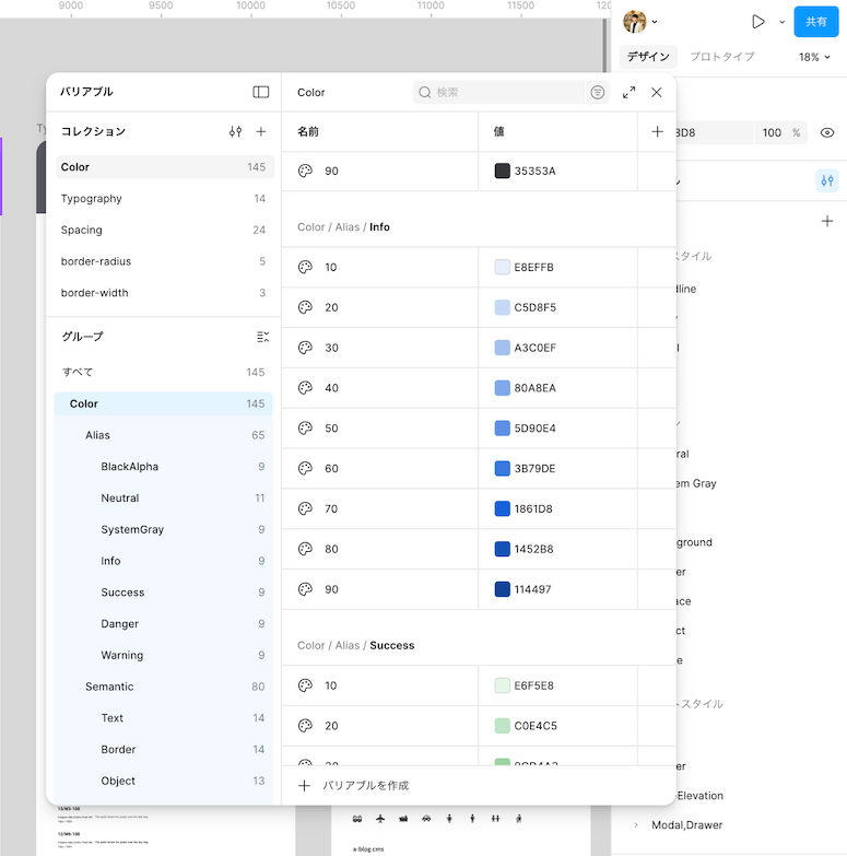 また、「今すぐ使える」ことを意識し、スタイルガイドに含めた各項目は Figma のバリアブル機能にも登録しています。デザイン作成時にはスタイルを選択するだけで適用できるため、UI制作をスムーズに進められる状態になっています。