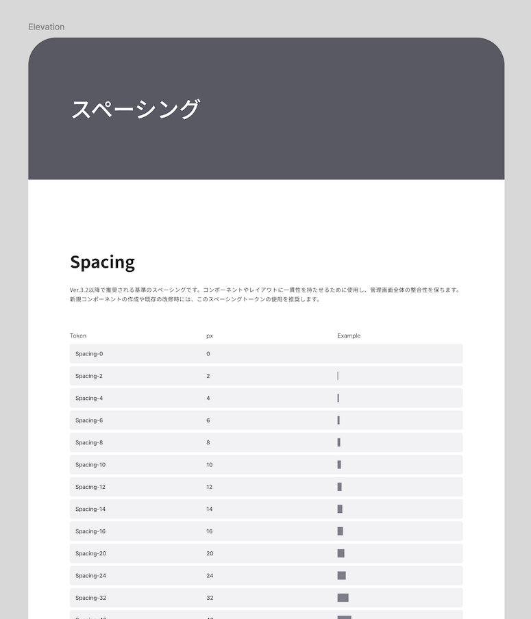 スタイルガイドには、カラー、スペーシング(余白)、タイポグラフィ、アイコンやUIパーツといった、管理画面を構成する要素を網羅的にまとめています。それぞれの項目について、役割や使いどころが分かるよう整理し、UI設計時の判断に迷いが生じにくい構成にしました。