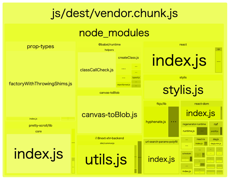 },これでvendor.chunk.jsの中から、reactやreact-dom、prop-typesなどのモジュールを追い出すことができたので最終的にバンドルサイズは213KB(非圧縮時 385KB)になりました。先ほどの画像と見比べてみると、reactやprop-typesなどのモジュールがなくなっているのが確認できると思います。