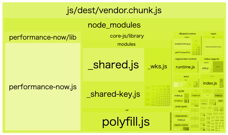 フロントで使うindex.jsのbundleサイズが52KB(非圧縮時95KB)、管理画面で使うadmin.jsが156KB(非圧縮時 269KB)なのに対し、フロントとindex.jsとadmin.jsが共通で使うvendor.chunk.jsも967KB(非圧縮時2.16MB)ありました。