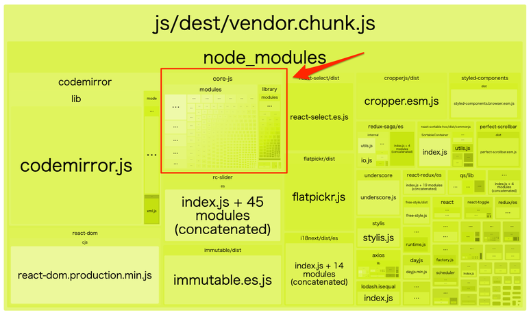 その結果、core-jsが実際に必要なモジュール(js)に使用されるようになるので、vendor.chunk.jsからはcore-jsがほとんどなくなりました。