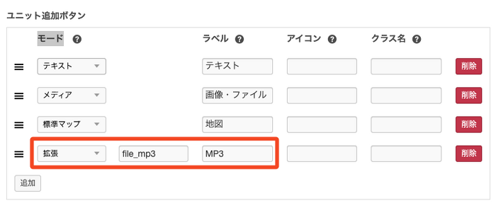 追加ボタンで1行追加し 拡張 を設定し file_mp3 のように設定します。ラベルは自由に設定で構いませんが分かりやすく mp3 としておきます。