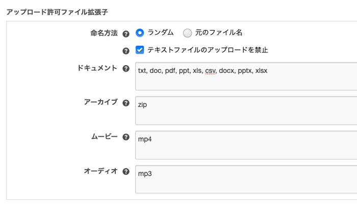 コンフィグ > 編集設定 > アップロード許可ファイル拡張子