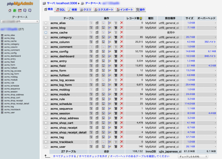 acms_cache の横のチェックボックスにチェックをつけ、表の下の方にあるプルダウンメニュー(チェックしたものを:)を テーブルを修復する を選択してみて下さい。