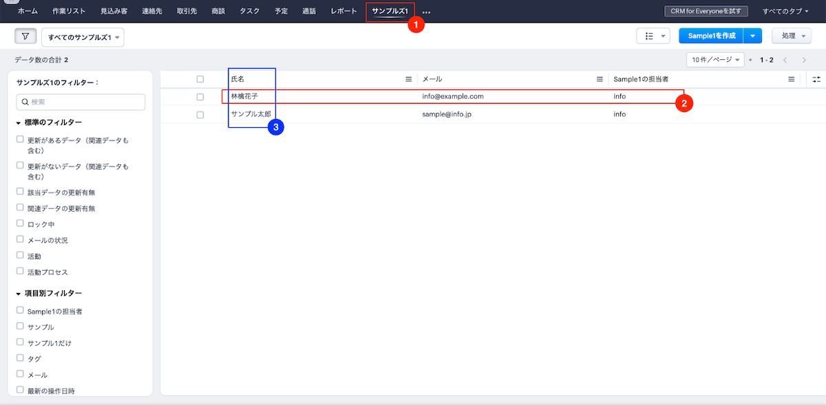 1 | タブ | データの種類を表す単位で、連絡先や取引先など同じ形のデータをまとめるもの。 |