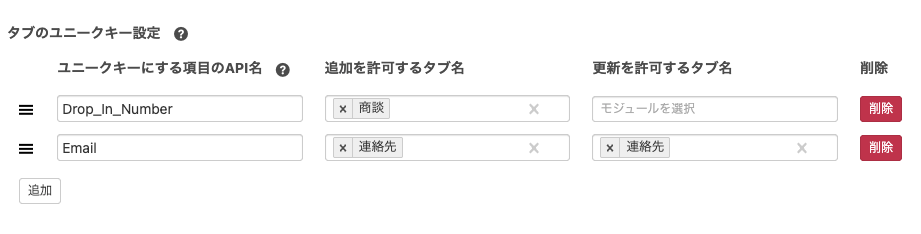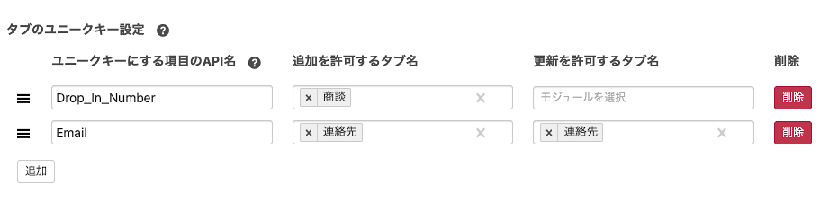 追加を許可するタブ名 | このユニークキーを使ってレコードを新規追加するZohoのタブを選択 |
