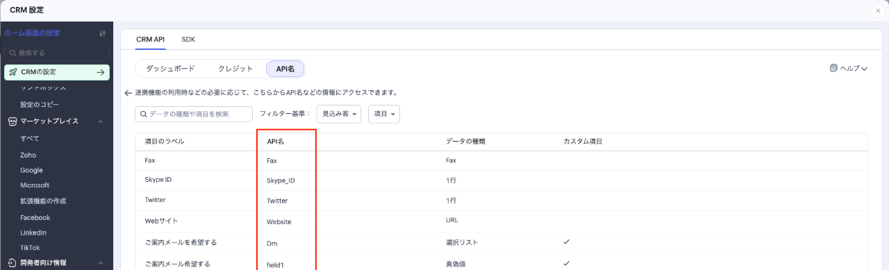 また、タブと項目には API名 という識別子が付いています。Zoho CRM の管理画面「設定 > 開発者向け情報 > API と SDK」で等タブの一覧と各タブに対応する項目一覧のAPI名を確認できます。a-blog cms 側の設定でこのAPI名を使う場面があるため、確認方法を覚えておいてください。