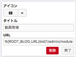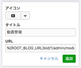 そうすると新規メニュー用の入力項目が表示されるのでそこにアイコンやタイトル、URLを設定します。グローバル変数をURLに使用することができます。