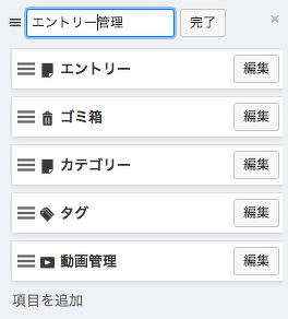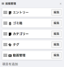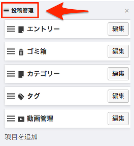 また、「投稿管理」や「サイト管理」などのメニューグループのラベル名を変更したりメニューグループ同士の並び替えも可能です。
