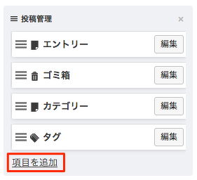 また、この機能ではオリジナルメニューを追加することもできます。以下の「項目追加」をクリックします。