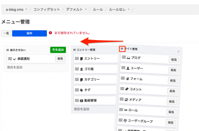 並び替えたいメニューグループの「ハンバーガーメニュー」をつかみドラッグ&ドロップで並び替えたいメニューグループの位置まで移動させます。