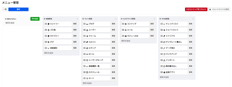 管理画面からコンフィグ > メニュー管理 に移動します。