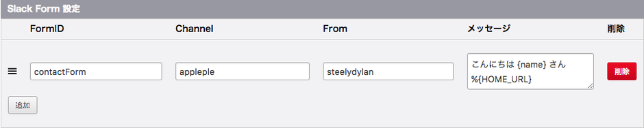 下の図のように、Slackに通知したいFormIDを指定し、メッセージの送信先チャネルを「Channel」に送信元の名前を「From」に設定します。またメッセージにはFormモジュールの変数と、グローバル変数を使用することができます。