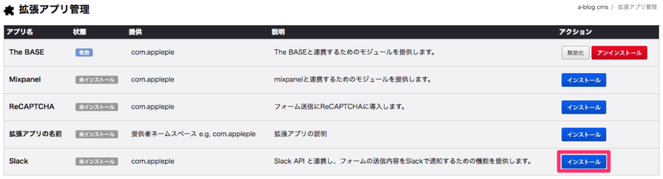 3. a-blog cmsの拡張アプリ Slackに Webhook URL を登録