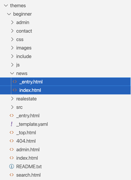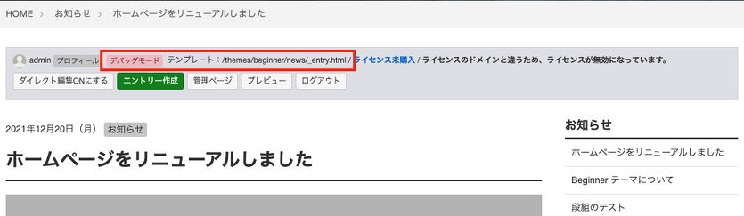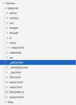 この例では、<!-- BEGIN entry:loop -->から<!-- END entry:loop -->の間を繰り返し表示しています。また、モジュールのコメントタグについては実行後には削除され、通常のHTMLソース側には表示されません。