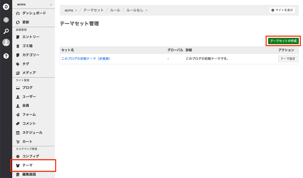 オリジナルのテーマを作る際に、一番最初に設定を変更する部分になります。管理ページ > テーマ にアクセスして「テーマセットの作成」ボタンをクリックしてください。(Ver. 3.1.0 以上では「このブログの初期テーマ」は非推奨になりました。)