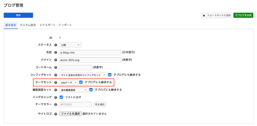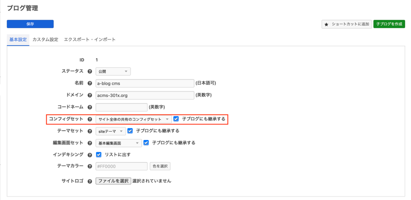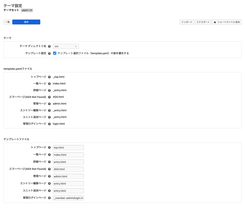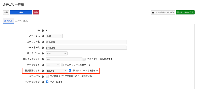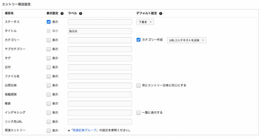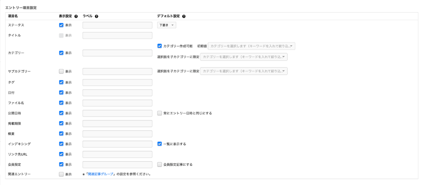 エントリー編集ページの基本入力欄の表示・非表示の設定や、ラベルの変更、初期値の設定を行えます。