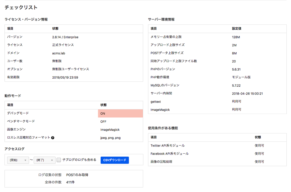 a-blog cmsの管理ページでは、設置されているライセンス、バージョン、サーバの情報や、現在の動作モード、キャッシュの状態、フォームの設定など、公開時にチェックしておきたい情報を表示しています。
