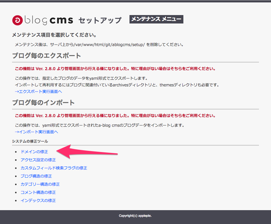 本番サイトのメンテナンスメニュー( URL:http://現在の公開URL/setupフォルダを変更後の任意名/index.php )へアクセスし、ドメイン名の修正を行います