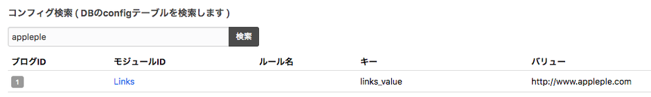 入力欄にキーワードをいれ検索すると、コンフィグ設定をDBから検索できます。 これにより、テスト用のコンフィグやテスト用のメールアドレスなどを管理画面から簡単にみつけられます。 また、検索結果からモジュールの設定画面に移動できるので、すぐに変更できます。